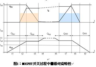 功率MOSFET管的柵極電荷特性如圖1所示,此特性圖可以在MOSFET數(shù)據(jù)表中查到,開通的工作過程可以參閱相關(guān)的文獻。值得注意的是:下面的開通過程對應(yīng)著BUCK變換器上管的開通狀態(tài),對于下管是0電壓開通,因此開關(guān)損耗很小,可以忽略不計。