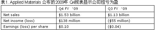 Applied Materials 近日公布的09年第4季財(cái)報(bào)顯示公司已扭虧為盈,凈收入實(shí)現(xiàn)1.38億美元,而上季虧損為5500萬美元。其Q4銷售額為15.3億美元,其中半導(dǎo)體設(shè)備銷售占6.56億美元,公司同時(shí)已收到了6.29億美元的半導(dǎo)體設(shè)備新訂單。