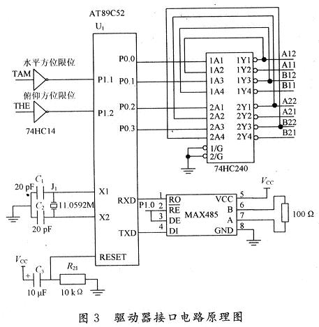 跟蹤系統(tǒng)中微處理器選用89系列性價比高和功耗低的89C52。74HC14芯片是6非門施密特觸發(fā)器,與P1.1和P1.2口相連,控制方位限位信號。74HC240芯片,八反相三態(tài)緩沖器/線驅動器,用于數(shù)據(jù)緩沖及總線驅動。系統(tǒng)使用兩片74HC240芯片,通過P0口引腳控制,兩片74HC240的16個輸出引腳作為步進電機驅動電路的輸入控制信號,分別控制步進電機俯仰方向和水平方位的正反轉。系統(tǒng)與上位機的通信選用MAX485接口芯片,由P1.0口控制其收發(fā)狀態(tài)。驅動器接口電路如圖3所示。