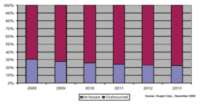 iSuppli公司對于內部及外部制造的機頂盒營業(yè)收入百分比情況的預測。