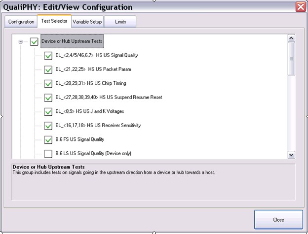 QualiPHY軟件支持用戶可定制化測試項(xiàng)目,可以選擇單個或多個項(xiàng)目分別測試,從而大大提高了靈活性。圖2描述的是USB2.0 High Speed的Device or Hub測試項(xiàng)目定制窗口。