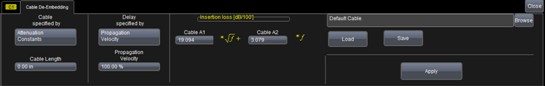 在使用示波器結合同軸電纜測量脈沖信號時,為保證測量的精確性與一致性,必須去除電纜的效應。力科WaveMaster8Zi系列示波器擁有電纜去嵌(cable de-embedding)功能,在每個通道中均可選擇是否激活此功能(下圖所示為cable de-embedding的操作界面)。可以使用兩種方法來輸入電纜的特性:一種是電纜的衰減常數,包括了電纜長度、傳輸速度、插入損耗的多項式系數;另一種是直接輸入多個頻率點的插入損耗(即S參數的S21)。電纜的特性參數可以從電纜廠商處獲得,或者使用TDR或矢量網絡分析儀測量。