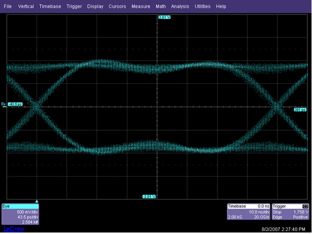 2、接收端信號波形和眼圖信號經過背板和連接器,到達接收端,信號變差,眼圖變小,如圖8、圖9所示。如果不使用均衡技術,系統很容易出現誤碼,因此在高速接收芯片內部通常需要嵌入均衡器。