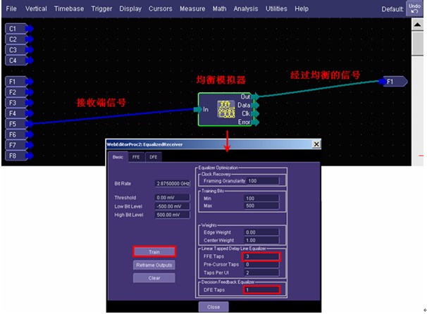 4、均衡模擬器把經過背板的已衰減信號加到示波器的均衡模擬器上,查看經過均衡的信號眼圖。根據接收芯片實際情況,我們把FFE和DFE的抽頭數分別設為3和1,點擊Train,對均衡器進行訓練(圖12),就得到了均衡后的信號,其眼圖如圖13所示。