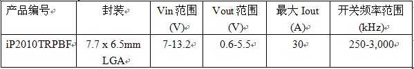 iP2010的輸入電壓范圍為7V至13.2V,輸出電壓范圍則為0.6V至5.5V,輸出電流高達(dá)30A。這個(gè)器件最高運(yùn)行頻率為3MHz。在5MHz運(yùn)行時(shí),與iP2010引腳兼容的iP2011備有相同的輸入和輸出電壓范圍,但后者經(jīng)過優(yōu)化,從而使最高輸出電流高達(dá)20A。通過以通用占位面積提供多種電流額定值器件,IR提供的靈活性能夠滿足不同客戶對電流水平、性能和成本的要求。