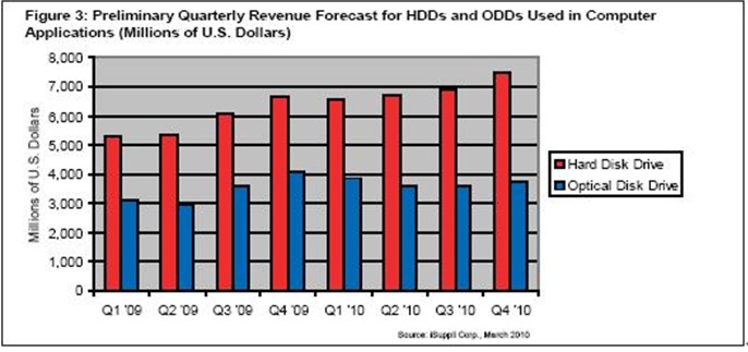 據(jù)iSuppli公司,繼2009年下滑之后,預計2010年用于電腦的硬盤(HDD)和光驅(qū)(ODD)全球營業(yè)收入將增長,因為PC出貨量將隨著全球經(jīng)濟復蘇而上升。