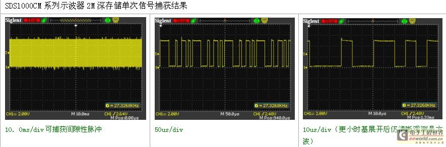 由此看來,在存儲深度一定的情況下,采樣率越高,采樣時間就越短。隨著信號的日益復雜,想要完整地呈現信號的全貌或是信號間的相對關系,單憑高采樣率無法實現,還需要長時間的采樣捕捉獲得較長的信號。傳統示波器,在此需求下,采樣率和采樣時間本身是矛盾的,既需要高采樣,又需要長采樣時間,在存儲深度一定且不大的情況下,是根本無法實現。經過創新性設計的SDS1000CM系列數字示波器,擁有同級別產品中最大的2Mpts存儲深度,完美地調和這兩者的矛盾。提高示波器的存儲深度可以間接提高示波器的采樣率。以一臺采樣率為1Gsa/s、存儲深度為20K的示波器為例來說,只要水平掃描速度在20ns/div以上時基,采樣速度就會急速下降。因為當需要測量較長時間的信號波形時,必然要求大的時基檔位,這就造成采樣率的下降,采樣率的下降可能會遺漏信號的細節勢必造成信號波形質量的下降。這時候就需要大的存儲深度來維持更高的采樣率來采樣測量。長存儲在保證獲取不失真的波形的同時又可以觀察更長時間的信號。
