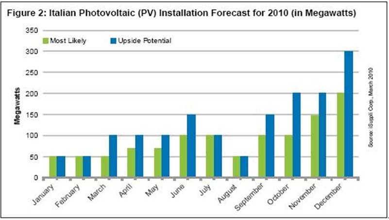 最可能出現的情況是,2010年意大利市場將安裝1.1GW,年終的四個月需求將會大增。但是,由于將下調FIT,意大利2010年安裝容量也很有可能高達1.5GW。