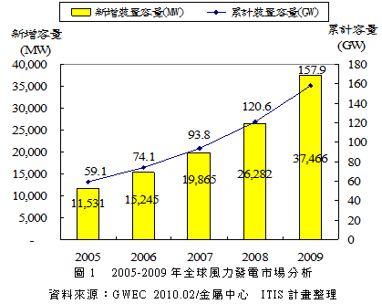 2009年全球風力發(fā)電市場不畏金融海嘯沖擊,在美國及中國政府大力推廣下,新增風力發(fā)電裝置量仍較2008年成長31%。但因2009年新增容量主要來自既有存貨,風力機接訂單量僅為15,717MW,較2008年衰退41%。前瞻2010年,在中、美及歐洲風電大國帶動下,全球風力發(fā)電新增容量將較2009年成長15%;而風力機接單量受到價格驟降及主要風電大國景氣回升影響,可望庫存回補而為2009年的2.2倍。