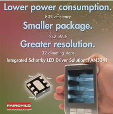 這款升壓LED驅動器在1.2MHz開關頻率下運作,并集成了一個肖特基二極管,可最大限度地減小外部無源組件和總體線路板空間的體積。使用FAN5341的簡單單線接口,設計人員可將數字脈沖從微控制器傳向FAN5341,從而輕易控制LED的亮度水平。此外,由于這款照明解決方案驅動三至五個串行LED,因此每個LED所通過的電流都相同,確保達到同等的亮度。此外,該器件提供高達83%的效率,能夠最大限度地減少功耗,滿足便攜設計之空間和功耗需求。FAN5341采用緊湊的薄型2mm×2mm UMLP封裝。