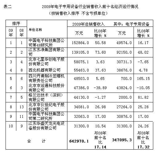 2009年電子專用設(shè)備行業(yè)前十名銷售收入總額達到64.3億元,占全行業(yè)銷售收入的69.9(2006年為61% 2007年為63.9% 2008年為66.5%),比2008年的前十名銷售收入增長17.14%。入圍前十名的銷售收入也從2008年的2.82億元提高到2009年的3.13億元。中國電子科技集團公司第四十八研究所,2009年在太陽能設(shè)備和太陽能電池片的推動下得到了快速的發(fā)展,總銷售收入達到15.3億元,繼續(xù)位居行業(yè)的首位。