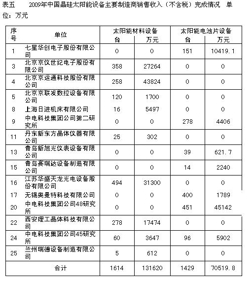 2009年下半年在光伏產(chǎn)業(yè)市場的推動下,我國晶硅太陽能設(shè)備得到迅速復(fù)蘇,2009年我國主要太陽能電池制造商太陽能設(shè)備銷售收入比2008年增長了14.44%,達到20.21億元。其中:太陽能級晶硅生長和加工設(shè)備增長7.34%,達到13.16億元,占太陽能電池設(shè)備銷售收入的65.1﹪(2008年為69.4%);晶硅太陽能電池芯片制造設(shè)備增長30.56%,達到7.05億元,占太陽能電池設(shè)備銷售收入的34.9﹪。