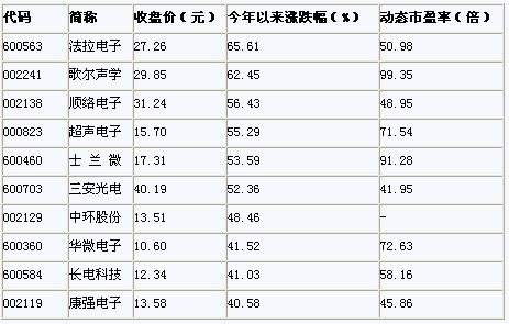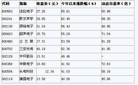 二級(jí)市場(chǎng)的表現(xiàn)一向來(lái)都是先于上市公司的經(jīng)營(yíng)情況的。今年以來(lái)許多電子類公司就出現(xiàn)了不同程度的上漲,該行業(yè)的今年以來(lái)算術(shù)平均漲幅達(dá)20.6%。其中今年以來(lái)漲幅最大的是法拉電子,上漲達(dá)65.61%。其次是歌爾聲學(xué),上漲幅度達(dá)62.45%。特別注意的是隨著一季度業(yè)績(jī)的公布,這些大幅上漲的個(gè)股,由于凈利潤(rùn)的同時(shí)上漲,PE也并未明顯增高。