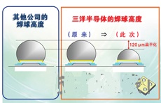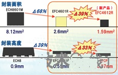 后者的封裝采用了兩項(xiàng)扁平化技術(shù)。一是改變了焊錫球的形狀。從原來(lái)的球狀改為了半球狀,高度降低了120μm。第二項(xiàng)是封裝背面的保護(hù)膜技術(shù)。將Si部分的高度比原產(chǎn)品降低80μm,并為確保強(qiáng)度而在背面粘貼了20μm的保護(hù)膜。這減少了60μm的高度。兩項(xiàng)技術(shù)加起來(lái),此次將高度從已有的EFC4601R的550μm降低了33%至370μm。