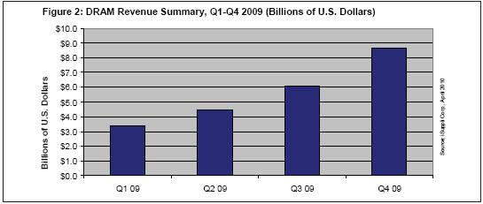 2009年第一季度創(chuàng)下2001年以來(lái)的最低營(yíng)業(yè)收入,DRAM產(chǎn)業(yè)隨后持續(xù)穩(wěn)步改善,第四季度營(yíng)業(yè)收入達(dá)到87億美元,比第三季度的61億美元?jiǎng)旁?3%。這樣的結(jié)果足以使2009年第四季度成為過(guò)去10年來(lái)DRAM市場(chǎng)表現(xiàn)最好的五個(gè)季度之一。