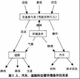 汽車道路交通事故是世界性的災害,因此汽車交通安全也是世界性的難題。道路交通事故引起人的傷亡,財產(chǎn)的損失,給國民經(jīng)濟也帶來了巨大的損失。然而誘發(fā)交通事故的因素是多方面的,它受汽車行車速度、道路條件、車輛狀況、駕駛員行為、駕駛員的文化素質和自然環(huán)境等因素的綜合影響。其中人、汽車、道路、環(huán)境條件是影響道路交通安全的主要因素,它們之間的關系見圖2。