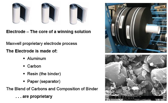 如上圖2所示,為Maxwell超級電容的電極,這被認為是他們超級電容器技術的最關鍵部分。這個電極是由鋁,碳元素制成,其中樹脂作為粘合劑,紙作為隔膜。