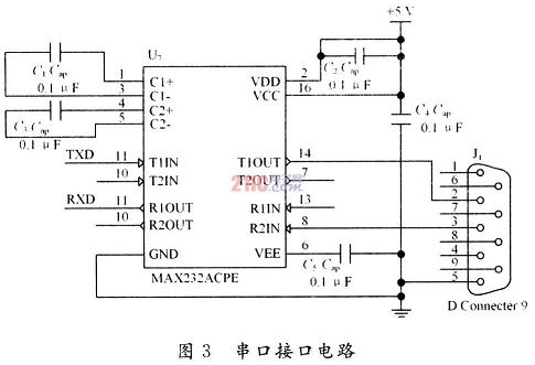 RS232標準是美國電子工業聯合會(EIA)制定的一種串行物理接口標準,它適合于數據傳輸率在O~20000b/s范圍內的通信,目前廣泛用于計算機與終端或外設之間的近端連接。實際工作時,應保證電平在5~15V之間。所以為了與單片機進行通信。必須對其電平進行轉換。現在常用的轉換芯片是MAX232。MAX232內部有電壓倍增電路和轉換電路,只需5V電源便可實現TTL電平與RS232電平的轉換,使用十分方便。串口接口電路如圖3所示。