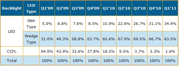 『針對10.1"W, 11.6"W,13.3"W等尺寸,搭載薄型 LED 背光板的面板主要被用在CULV(Consumer Ultra Low Voltage)的機(jī)種上,用以標(biāo)榜省電及薄型化。尤其13.3”W機(jī)種,薄型化更是主流。』Anita Huang 接著表示,『薄型 LED 背光板的優(yōu)點(diǎn)在于其薄化與輕量化可以讓消費(fèi)者快速的感受到。不過由于CULV機(jī)種的銷售并不如預(yù)期,為了更明確的進(jìn)行差異化,品牌廠商今年卷土重來進(jìn)而推出全系列的薄型Notebook PC。并同時(shí)要求面板廠商縮小薄型 LED 背光板與楔形LED背光板的成本與價(jià)格差距。』