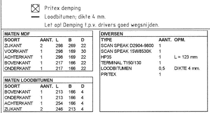 為了避免箱體共振,對兩側箱板和上、下面板使用22mm厚的中密度纖維板(MDF),前面板則使用30mm厚的MDF。6塊箱板的內表面最好全部貼上4mm厚的鉛皮(但較貴),也可貼上相同厚度的瀝青油毛氈進行聲阻尼。在箱板開口處應仔細地將阻尼材料剪掉,以免妨礙驅動單元和出聲管的安裝。