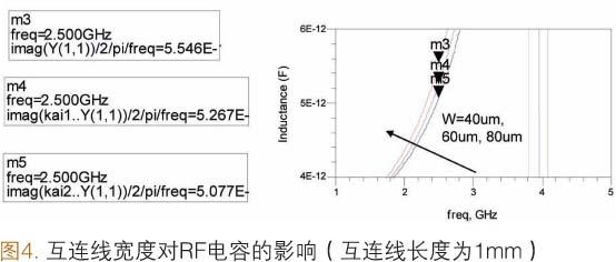 除互連線長度之外,互連線的寬度也會對RF電容產(chǎn)生影響。在襯底的制作過程中,線寬通常會發(fā)生變化(舉例來說,與設(shè)計寬度相比,實際線寬的變化范圍為±10.0μm~±15.0μm)。如圖4所示,如果設(shè)計的互連線為1.0mm長,60.0μm寬,實際卻達(dá)到40.0μm寬,在2.5GHz下等效電容變化將達(dá)到5.3%(以3.0pF接地SMD電容為例)。如果把這種SMD電容用于濾波器中,對于RF應(yīng)用來說,電容值5.3%的變化將導(dǎo)致約2.7%的頻移。我們必須對RF應(yīng)用中含有SMD電容的RFSiP模塊的襯底制造容差進(jìn)行細(xì)致研究。