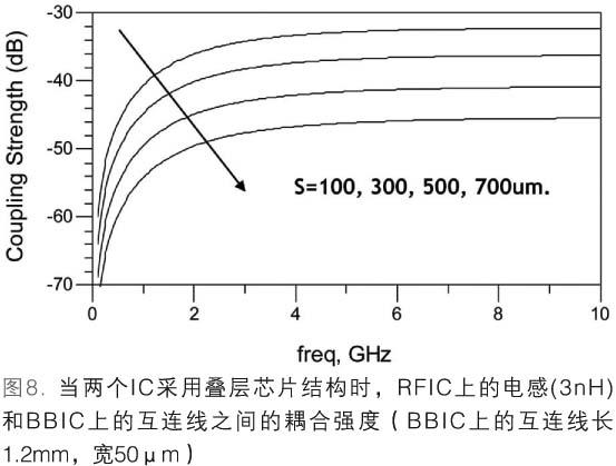 圖8表示了BBIC和RFIC電感之間的耦合強度(未使用隔離層)。假設(shè)BBIC和RFIC的厚度為250.0μm時,對VCO電路中的3nH電感進(jìn)行了研究。BBIC中主時鐘的互連線設(shè)置為1.2mm長。根據(jù)模擬結(jié)果,當(dāng)橫向距離(S)為100.0μm時,2.5GHz下的隔離為-35dB。這一隔離值對大多數(shù)RF應(yīng)用來說是不夠的。當(dāng)橫向距離為700.0μm時,隔離值提高為-50dB,這個值對大多數(shù)RF應(yīng)用來說仍然不夠。為保證VCO電感的性能,位于BBIC電感上方的主時鐘不能使用長互連線。根據(jù)以上分析,我們還應(yīng)對RFSiP使用的疊層芯片法做進(jìn)一步研究,從而判斷BBIC和RFIC器件之間出現(xiàn)嚴(yán)重相互干擾的可能性。