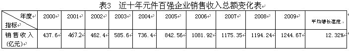 從本屆元件百強的整體銷售收入來看,第23屆元件百強企業2009年度銷售總額為1244.67億元,同比增長2.36%,同比增長率僅比去年(1.61%)略高,元件百強總體銷售收入增幅已連續三年低于10%。與第22屆元件百強的銷售總額相比,本屆元件百強的銷售總額增加了4.22%,近10年來,中國電子元件百強的銷售收入總額增長2.84倍,年平均增長率為12.32%(見表3,圖一)。