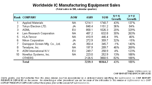 2009年的Q1,在全球金融危機(jī)的大環(huán)境下,半導(dǎo)體產(chǎn)業(yè)經(jīng)歷了史無(wú)前例的downturn。時(shí)隔一年,設(shè)備行業(yè)較上年Q1的增長(zhǎng)達(dá)到了 188%。 VLSI預(yù)計(jì)2010年全年設(shè)備行業(yè)總銷(xiāo)售額將達(dá)到476億美元,較2009年增長(zhǎng)95.8%,接近2000年480億美元的業(yè)界近20年最高鋒。