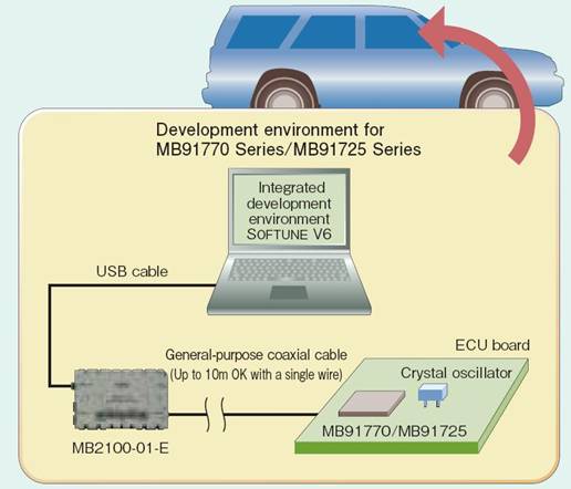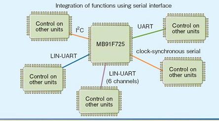 車用MCU連接的外圍相當多樣,而連接的接口可能是UART、頻率同步串行、LIN-UART和I2C,因此必須具備彈性的接口連接能力。為了滿足此需求,富士通將內(nèi)置式多功能串行接口用作串行通信接口,并透過軟件方式來切換上述各種接口,以靈活支持外部組件的通信規(guī)范,并提高系統(tǒng)設(shè)計的自由度。新系列MCU還提供LIN-UART的6條通道,從而能夠與更多控制單元進行通信;其中MB91725系列因具有定時器功能的多條信道和A/D轉(zhuǎn)換器,更容易達成各種功能的整合。請參考(圖二)。