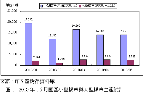 觀察1-5月國產小型轎車與大型轎車生產情形(圖1),小型轎車1月份的產量遠高于其他月份,乃部分產量對應2009年貨物稅減徵期間尚未消化的訂單,另外2月份較少的生產日數造成整車產量為各月中最低者,特別是大型轎車的部分。 相較于2010年第一季,預估第二季整車總產值衰退1.28%,小型轎車產值衰退8.5%,而大型轎車產值則有36.2%的成長。