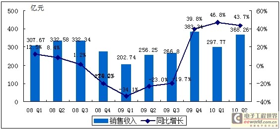 圖2008Q1——2010Q2中國集成電路產業銷售額規模及增長