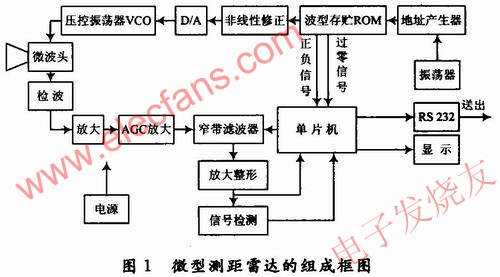 波形存儲選用E2PROM芯片AT28C64,晶體選用1.6834MHz。最重要的一點是必須測出微波頭的非線性曲線,以便在非線性修正ROM中裝入修正數據,簡化起見,可以在波形存儲ROM中燒制修正數據,無須再加專用的非線性修正電路。