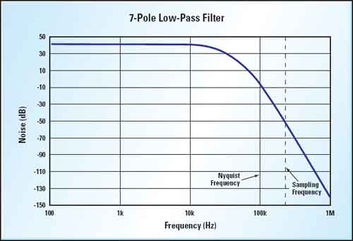 我們最好采用125倍的增益,以便多留一點(diǎn)余量。以40kHz這個(gè)最高信號(hào)頻率為例,取樣率便成為一個(gè)令人擔(dān)憂的問題。為免高于尼奎斯特頻率的混疊信號(hào)頻率,我們必須將取樣頻率的一半加以濾波,然后將振幅抑制至模擬/數(shù)字轉(zhuǎn)換器的1LSB以下。在這個(gè)例子中,我們所采用的是12位的模擬/數(shù)字轉(zhuǎn)換器,其參考電壓為4.096V,將得到1mV解析度,計(jì)算方法如下: