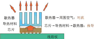 由于散熱器底面與芯片表面之間會存在很多溝壑或空隙,其中都是空氣。由于空氣是熱的不良導體,所以空氣間隙會嚴重影響散熱效率,使散熱器的性能大打折扣,甚至無法發(fā)揮作用。為了減小芯片和散熱器之間的空隙,增大接觸面積,必須使用導熱性能好的導熱材料來填充,如導熱膠帶、導熱墊片、導熱硅酯、導熱黏合劑、相轉變材料等。如圖2所示,芯片發(fā)出的熱量通過導熱材料傳遞給散熱器,再通過風扇的高速轉動將絕大部分熱量通過對流(強制對流和自然對流)的方式帶走到周圍的空氣中,強制將熱量排除,這樣就形成了從芯片,然后通過散熱器和導熱材料,到周圍空氣的散熱通路。