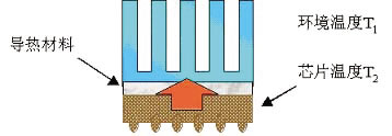 如圖1所示,目前比較常用的一種散熱方式是使用散熱器,用導熱材料和工具將散熱器安裝于芯片上面,從而將芯片產(chǎn)生的熱量迅速排除。本文介紹了根據(jù)散熱器規(guī)格、芯片功率、環(huán)境溫度等數(shù)據(jù),通過熱傳導計算來求得芯片工作溫度的方法。