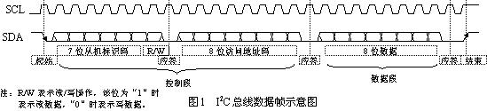 如圖1所示是常見的I2C總線上傳輸的一字節數據的數據幀,其總線形式是由數據線SDA和時鐘SCL構成的雙線制串行總線,并接在總線上的電路模塊即可作為發送器(主機)又可作為接收器(從機)。幀數據中除了控制碼(包括從機標識碼和訪問地址碼)與數據碼外還包括起始信號、結束信號和應答信號[4]。