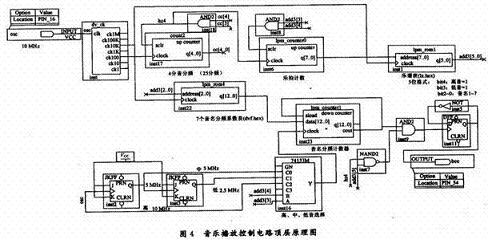 根據(jù)設(shè)計電路原理框圖,曲譜碼以分頻數(shù)編碼,音高信號分頻由一個可預置的模N計數(shù)器實現(xiàn)。分頻系數(shù)表和曲譜表都存儲在ROM中。若希望控制蜂鳴器的信號占空比為50%,分頻器的輸出信號采用二分頻電路實現(xiàn)占空比整形,但注意信號頻率被降低一半。電路原理框圖中M分頻器的作用是產(chǎn)生合適的時值計數(shù)脈沖頻率。電路的頂層原理圖如圖4所示。