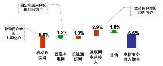 與2009年相比,2010年通信業運行狀況明顯好轉,行業收入增速大幅提高,固定電話拆機放緩,移動電話用戶與互聯網寬帶用戶繼續保持快速增長勢頭。