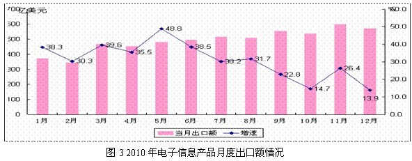 2010年是“十一五”規(guī)劃收官之年,也是我國電子信息產業(yè)回升調整的重要一年,受擴內需政策成效顯現(xiàn)和外需市場逐步回暖的共同作用,行業(yè)出現(xiàn)恢復性增長,總體呈現(xiàn)前高后穩(wěn)態(tài)勢。軟件產業(yè)和對外貿易出現(xiàn)新突破,經濟效益穩(wěn)步提高,投資持續(xù)高位增長,產品結構調整深入,產業(yè)鏈向上延伸的趨勢更加明 顯,企業(yè)、市場和區(qū)位布局出現(xiàn)新趨向,行業(yè)為推動信息化發(fā)展和促進兩化融合發(fā)揮積極作用,在國民經濟發(fā)展和全球產業(yè)布局中日益占據重要地位。