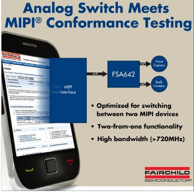 飛兆半導體公司(FaIRchild SemicONductor)開發(fā)了一款低功率、雙數據對2:1、高速MIPI開關產品FSA642。該器件是飛兆半導體MIPI兼容開關系列的新產品,是目前唯一通過MIPI UNH-IOL的700Mbps數據率互用性測試的MIPI開關。