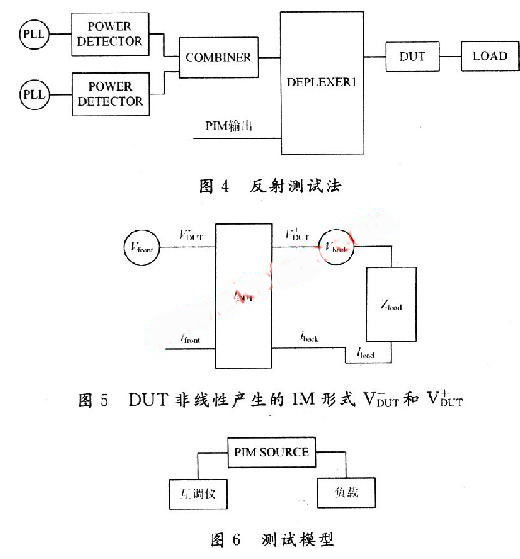 該系統(tǒng)中兩個(gè)大功率載頻f1和f2通過雙工濾波器發(fā)射到DUT,終端接50 Ω負(fù)載。PIM產(chǎn)生的雜散信號(hào)在DUT中產(chǎn)生,并在兩個(gè)方向傳播——“前向”到匹配負(fù)載,“反向”到雙工濾波器。發(fā)射激勵(lì)信號(hào)的頻率和被測的IM產(chǎn)物的頻 率由雙工濾波器的TX和RX通道決定。接收機(jī)測量反向傳播的IM波功率。