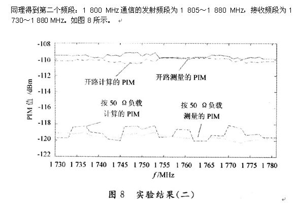 為了驗(yàn)證該方法的有效性,本文給出了兩個(gè)頻段的PIM值的計(jì)算與測量結(jié)果對比。頻段l:800 MHz的通信系統(tǒng)的發(fā)射頻段為869~894 MHz,接收頻段為824~849 MHz。如圖7所示。