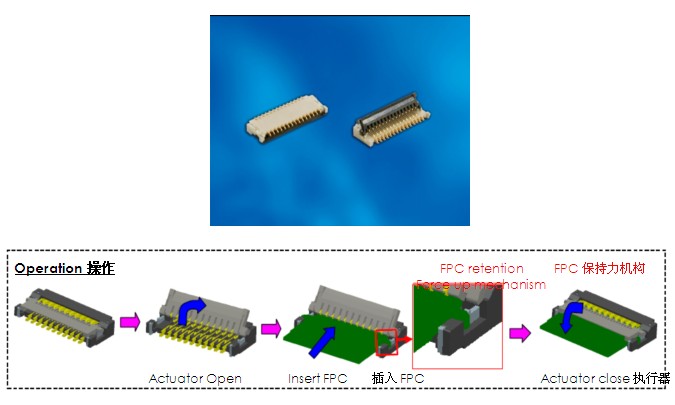 FCI提供的0.5毫米間距, 0.7毫米高度FPC 零插入力連接器可在高度極低的空間內(nèi)提供可靠的連接。它是原SVL系列(0.5毫米間距和0.9毫米高度 ZIF)的升級版,而SVL系列已經(jīng)被廣泛地認為是零插入力連接器的標(biāo)準(zhǔn),用于顯示背光燈和可觸摸屏式連接。該VLP0.7毫米高度系列具有相同的帶電纜鎖定功能及底部連接型式的后向觸發(fā)執(zhí)行器。