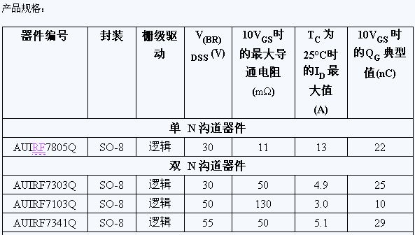 IR 的車用 MOSFET 都遵循 IR 要求零缺陷的汽車質量理念,并經過了動態和靜態器件平均測試及 100% 自動晶圓級目視檢查。