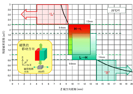 在電氣設計上,需要考慮傳感器的特性,使用的磁鐵特性,以及和傳感器的位置關系。圖7是模擬將鐵氧體磁鐵(5×4×6mm)沿Z軸(遠離傳感器)方向移動時的情況。從傳感器的磁滯開始,9.4mm以下輸出信號一定是“低”(靠近磁鐵,蓋閉合);14mm以上輸出信號一定為“高”(遠離磁鐵,蓋打開)。實際設計的時候,還需要考慮到傳感器特性的偏差、溫度特性,磁鐵的溫度特性,生產時以及時間長了之后傳感器的位置偏移。