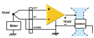 為了避免接地環(huán)路,需要選擇合適的接地模式,特別是在測量一個(gè)接地傳感器時(shí),應(yīng)該盡量避免使用單端輸入方式(RSE),這種方式會(huì)直接在數(shù)據(jù)采集設(shè)備與傳感器地間產(chǎn)生電流。如果使用的是差分方式(DIFF),由于電路為開路,因此電流被制止,從而較好地抑制了接地環(huán)路。當(dāng)然,相比于差分,通過隔離技術(shù)(見圖5),可以在不讓兩個(gè)地相連,分隔數(shù)據(jù)采集設(shè)備地的同時(shí),保持?jǐn)?shù)據(jù)值的傳輸,從而從根本上解決了環(huán)路問題.