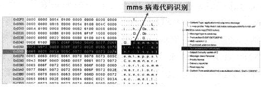 在網(wǎng)絡(luò)運(yùn)行的過(guò)程中,我們收到了如下的用戶投訴:“我的手機(jī)出現(xiàn)了1個(gè)奇怪的問(wèn)題,它總是自動(dòng)隨機(jī)發(fā)送MMS消息給我電話薄中的聯(lián)系人”。有的用戶投訴“收到1個(gè)可疑彩信,由1個(gè)txt文件和1個(gè)可執(zhí)行文件組成。txt文件為‘matrixremoveyou,removematrix’”。經(jīng)過(guò)確認(rèn),這些用戶的手機(jī)中了手機(jī)彩信病毒。根據(jù)病毒彩信樣本,顯示該病毒為“CommWarrior.A”病毒。具體病毒特征如圖1所示。