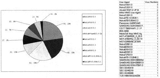 通過(guò)GPRS核心網(wǎng)抓包分析,目前用戶感染的彩信病毒類型主要是CommWarrior病毒,A,B,C分別是其的變種類型,具體感染的比例參見(jiàn)圖3。