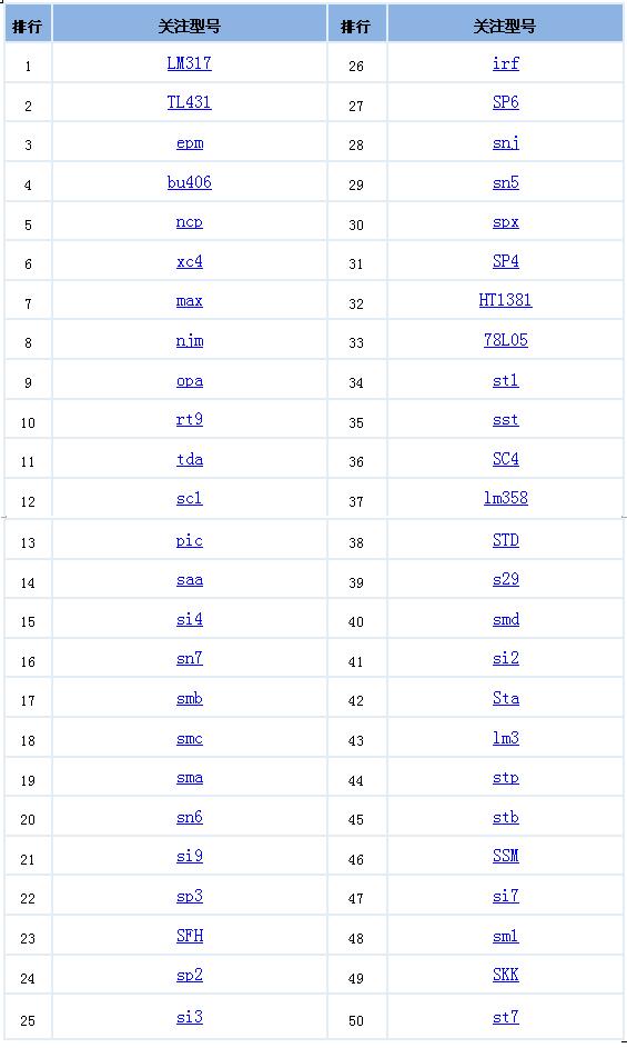 為客戶跑腿的除了快遞員,還可能是《華強(qiáng)電子》的小編!!!為了客戶跑遍華強(qiáng)北的小編你更是傷不起!從這個(gè)月起,商戶們記得要盯緊《華強(qiáng)電子》了,小編將定期不辭辛苦地掃蕩華強(qiáng)北市場,嘔心瀝血為廣大商家整理出一周熱門搜索排行榜!哪些IC型號最搶手,哪些獲得最多的詢價(jià),前50名讓你一目了然!如果您口味比較獨(dú)特,前50名沒有讓你感興趣的型號,盡管來電咨詢,小編恭候您的電話。有更好的建議歡迎交流,求關(guān)注!求進(jìn)步!