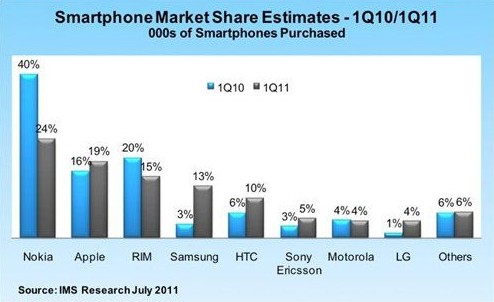 市場(chǎng)研究公司IMS Research表示,在傳統(tǒng)手機(jī)市場(chǎng),三星近年來(lái)的表現(xiàn)最為突出。該公司擁有多元化的產(chǎn)品組合,包括使用其自身操作系統(tǒng)bada以及Android和 Windows Mobile操作系統(tǒng)的產(chǎn)品,也包括廣受歡迎的Galaxy系列產(chǎn)品。該公司在智能手機(jī)市場(chǎng)的份額從2010年第一季度的3%左右一舉升至2011年第一 季度的13%以上。與此同時(shí),HTC等智能手機(jī)廠商的市場(chǎng)份額也大幅上升。
